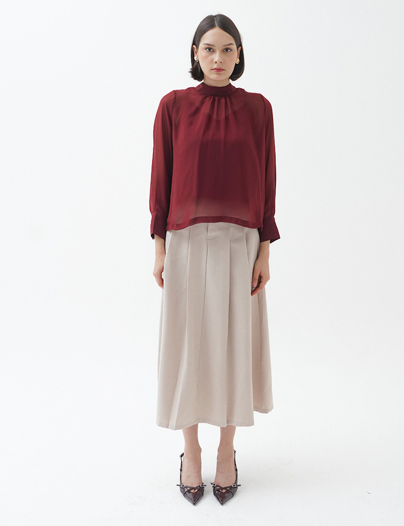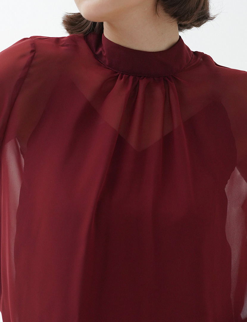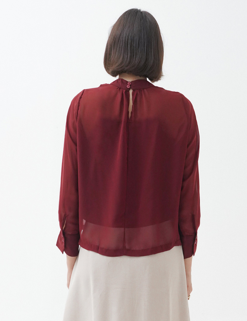 Blouse in sheer chiffon. Double-layered stand-up collar, opening at back with concealed buttons at back of neck, long, wide sleeves, and double-layered cuffs with a slit.