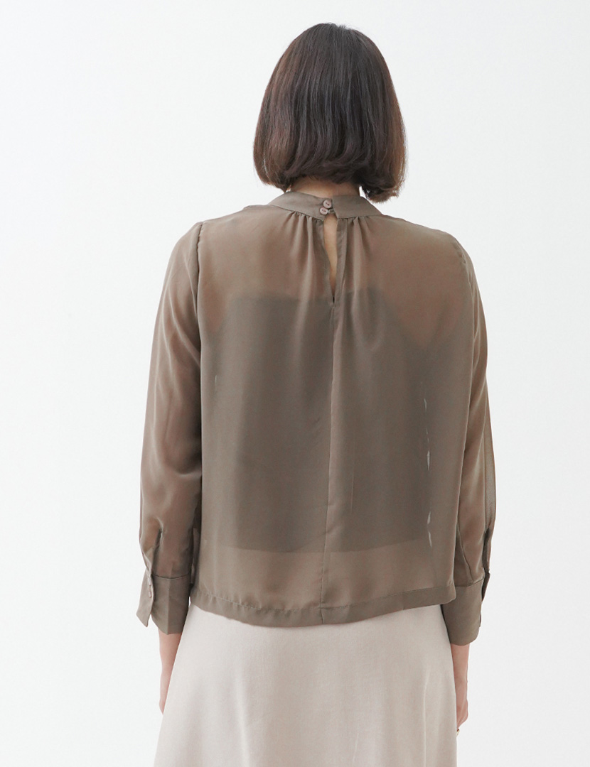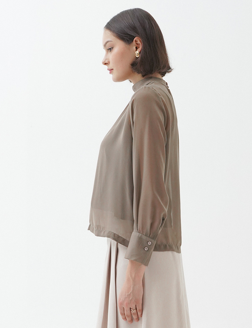 Blouse in sheer chiffon. Double-layered stand-up collar, opening at back with concealed buttons at back of neck, long, wide sleeves, and double-layered cuffs with a slit.