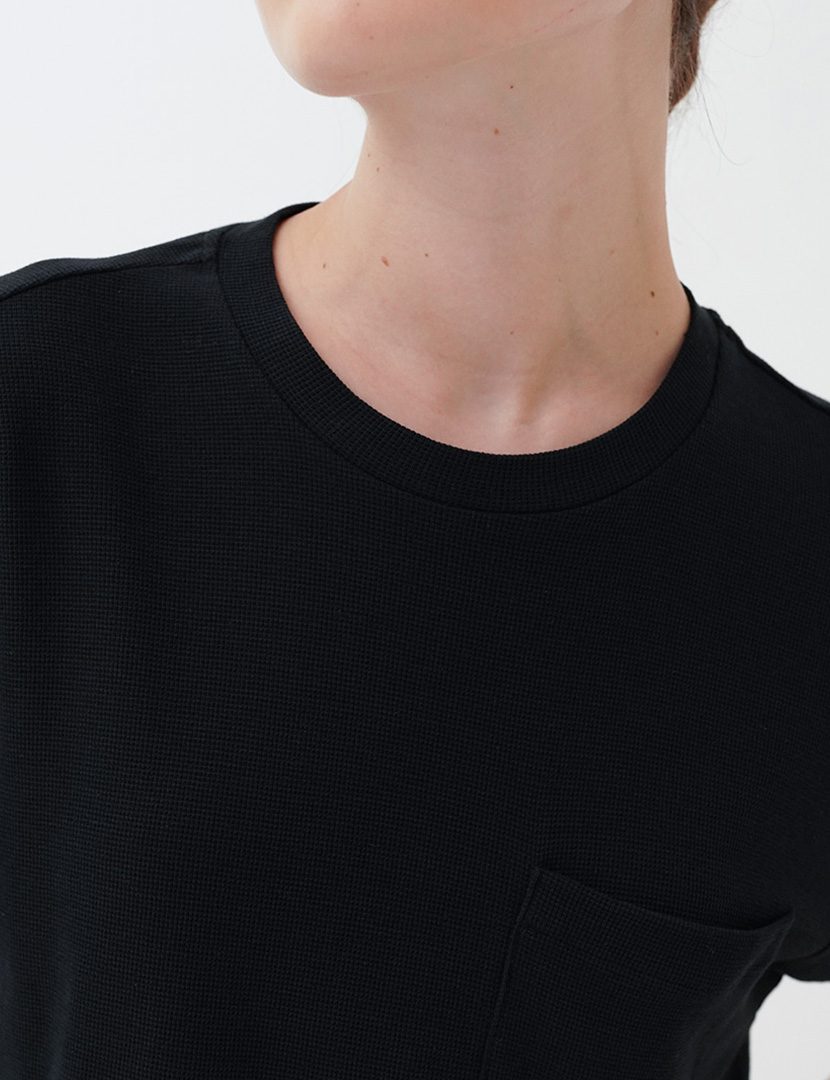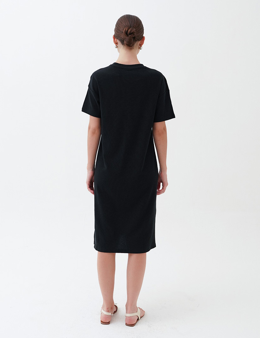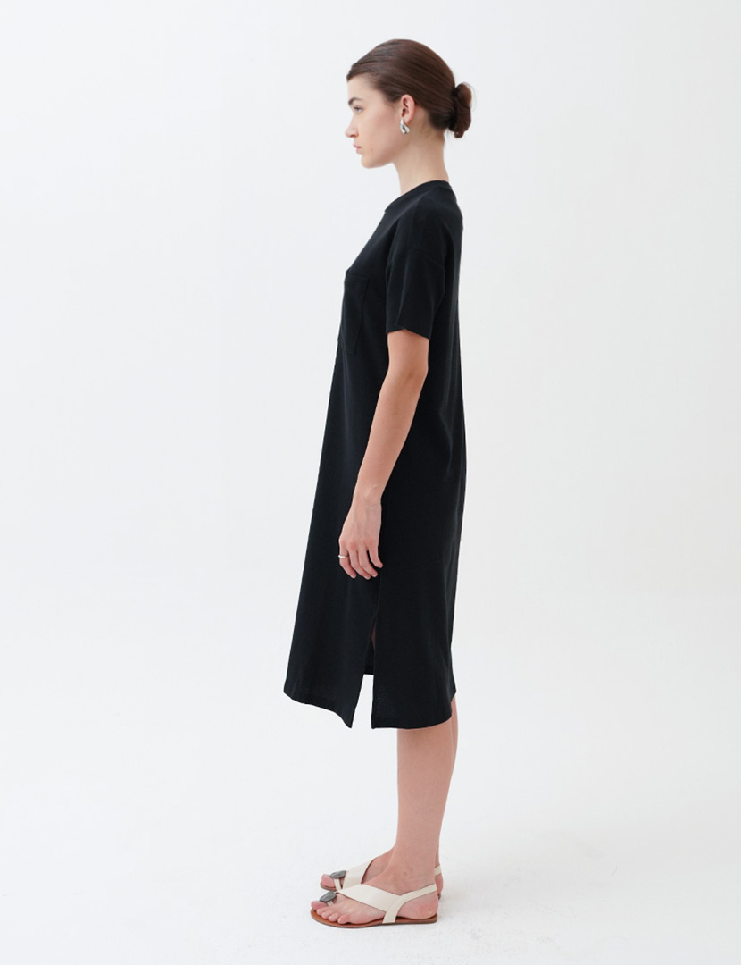 Midi dress with crew neckline and short sleeves. Features a relaxed fit and patch pocket at the front.