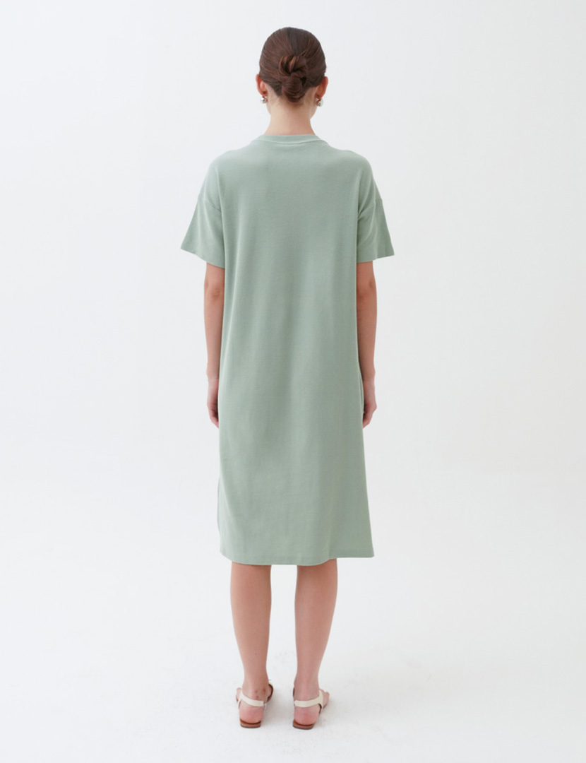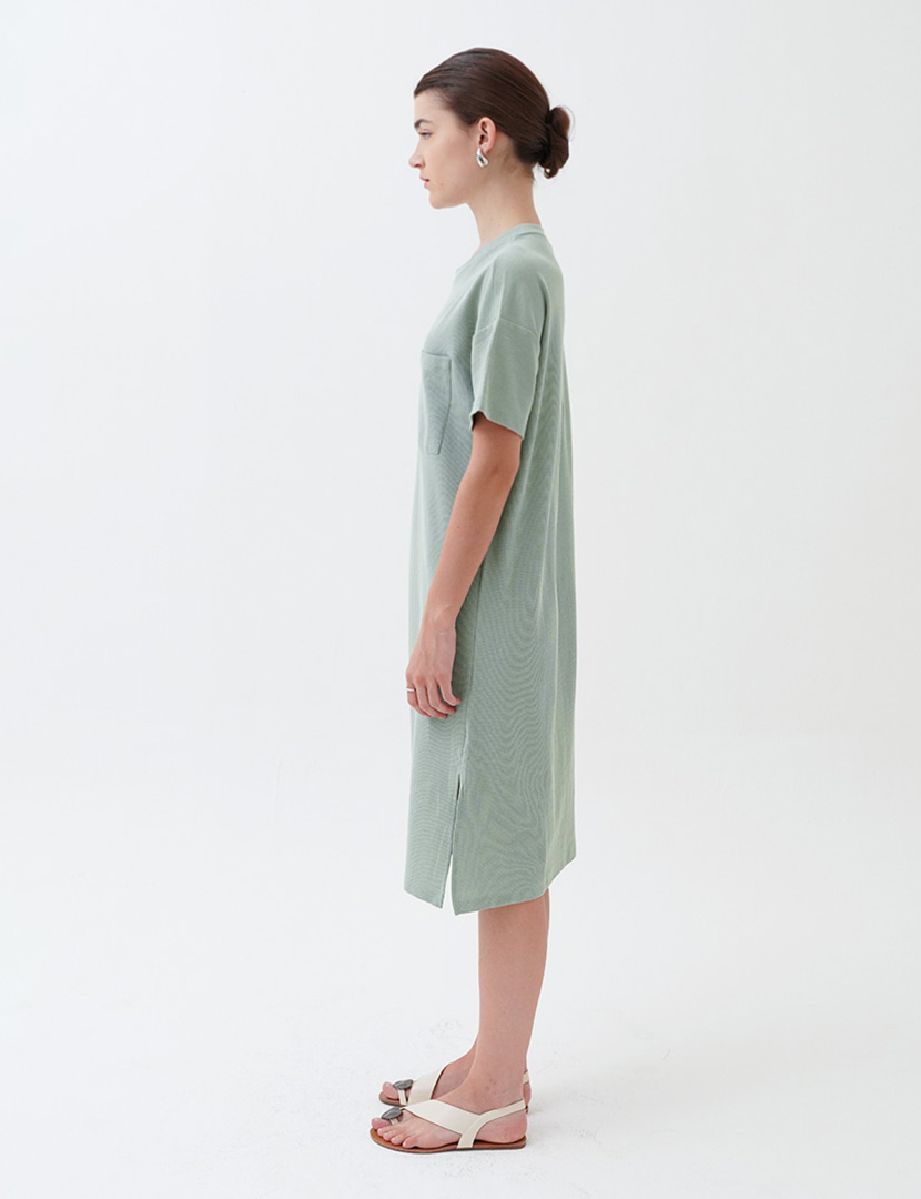 Midi dress with crew neckline and short sleeves. Features a relaxed fit and patch pocket at the front.