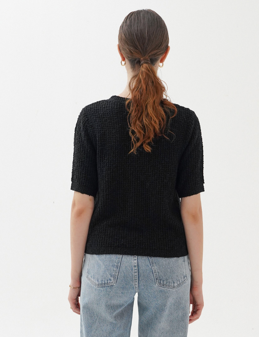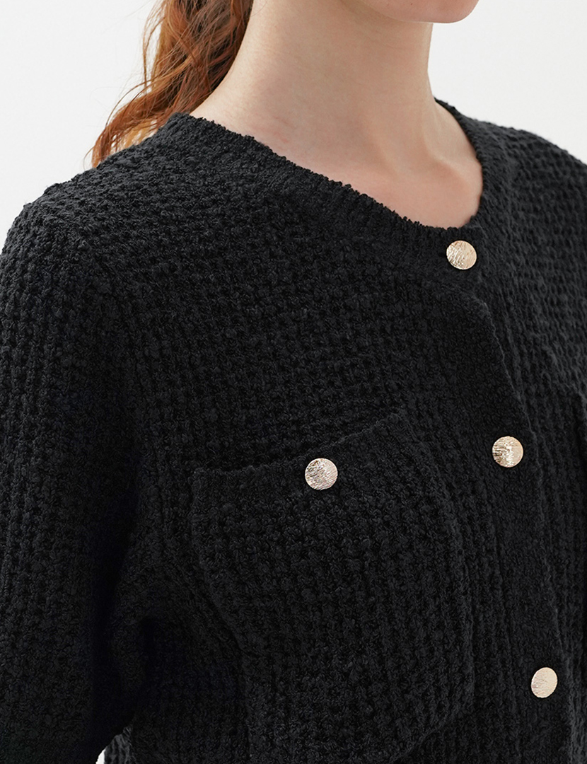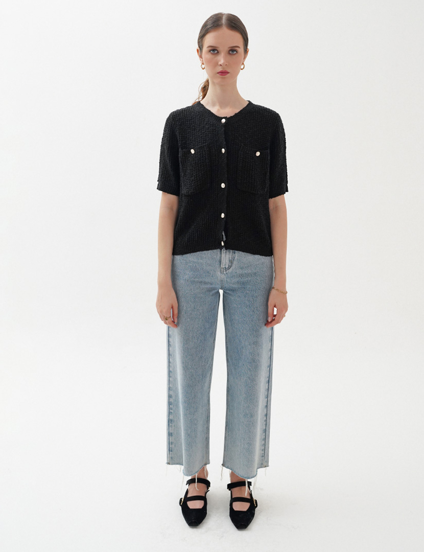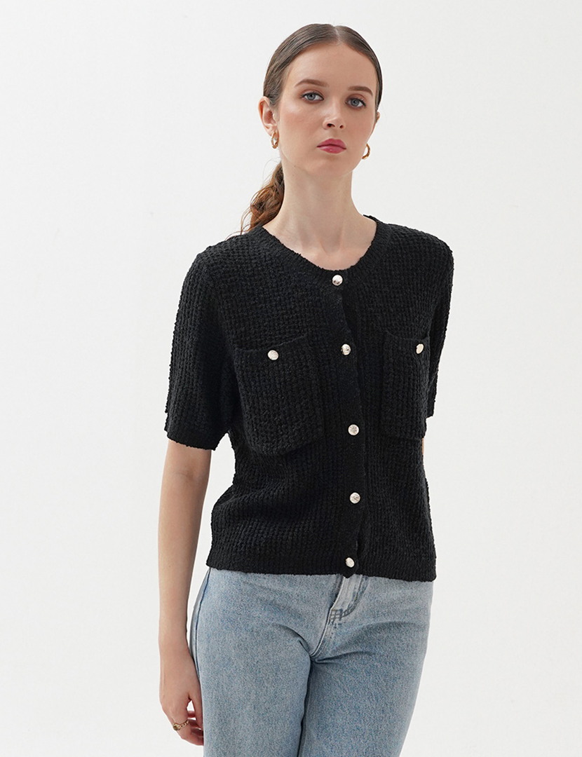 V-neck cardigan with short sleeves, featuring front patch pockets, ribbed trims, front fastening buttons.