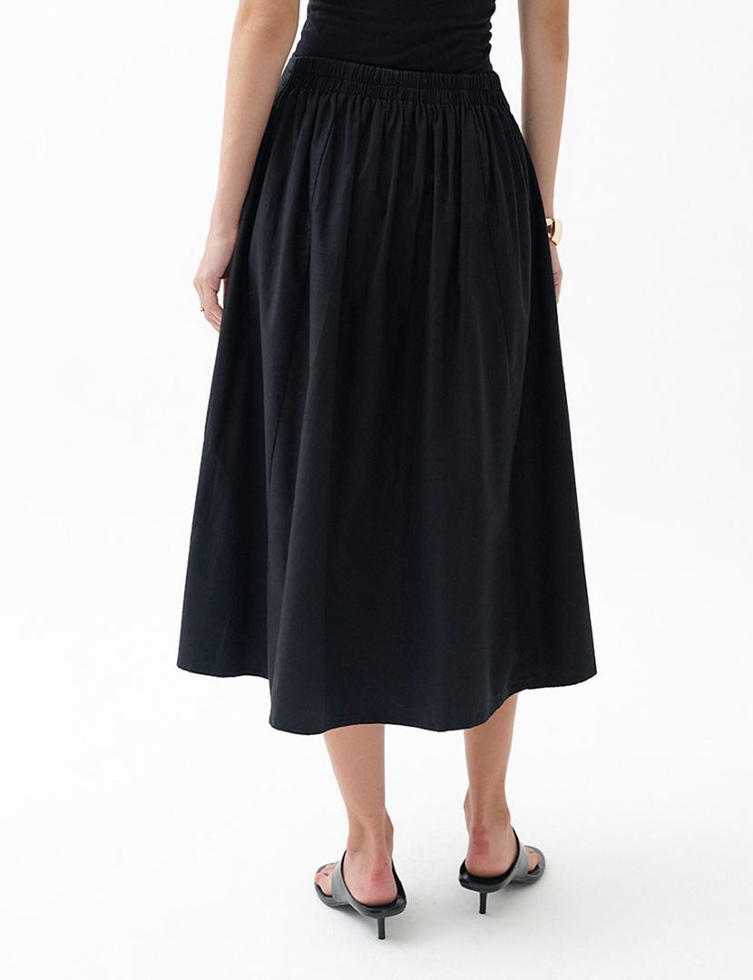 High-waist trousers with an elasticated waistband with invisible zipper at the side. Side pockets.