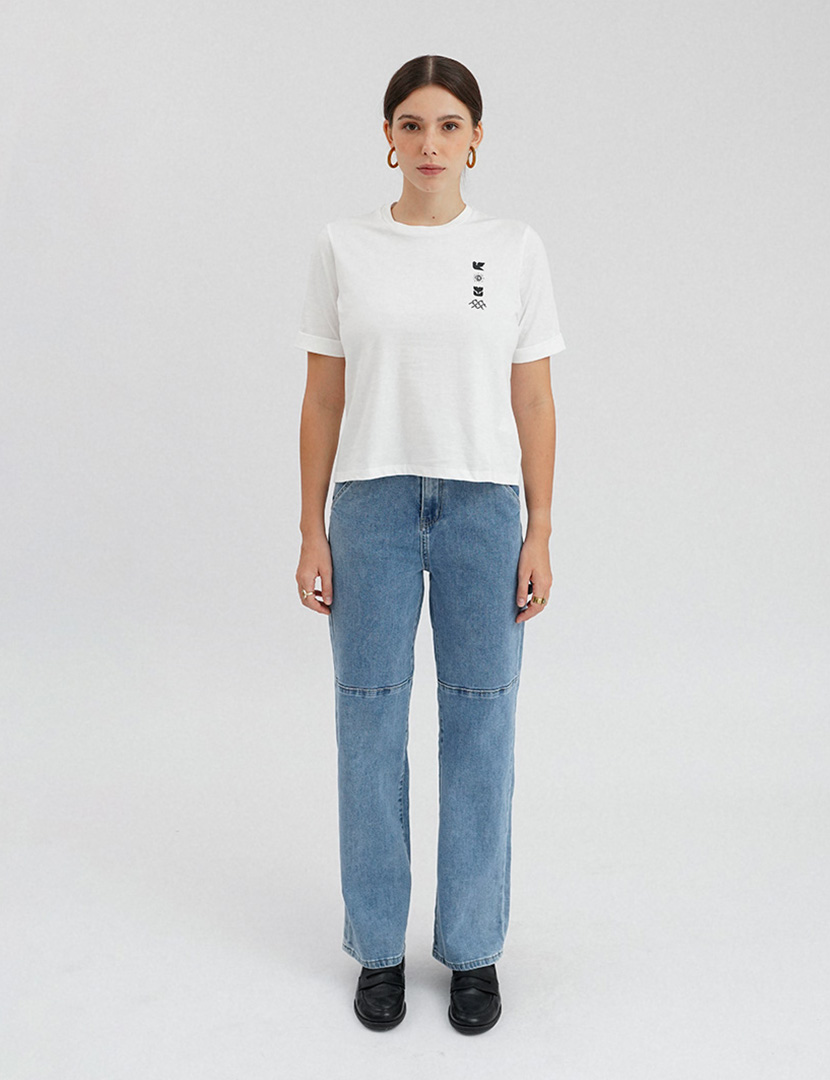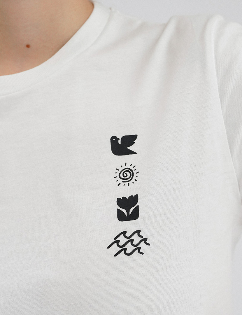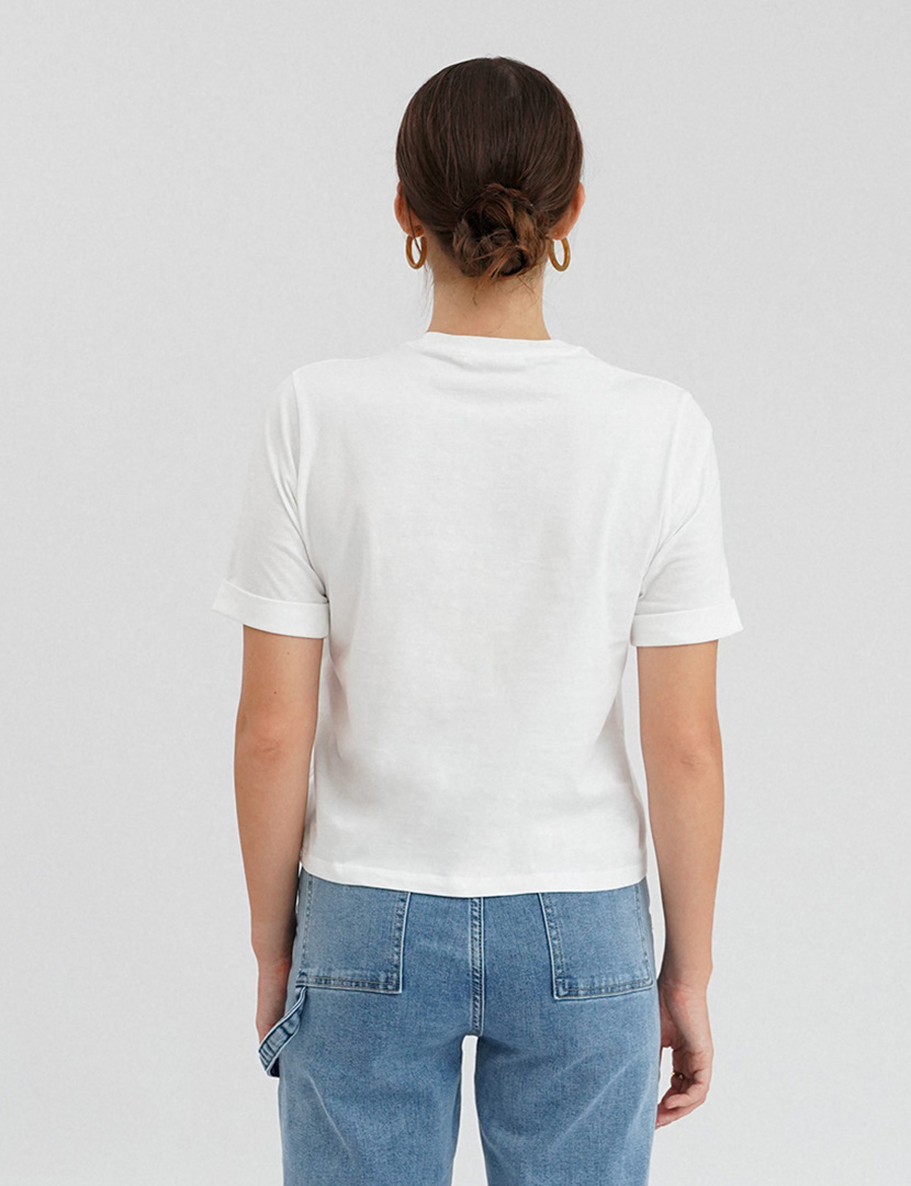 Cotton round neck T-shirt with short sleeves, slogan detail on the front.