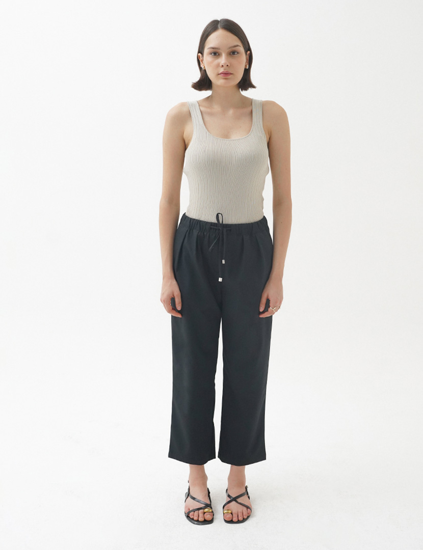 Flowing mid-rise trousers featuring an elasticated waistband with adjustable drawstrings, front darts and a straight-leg design high-waisted a-line flowy midi skirt with button and american zip fastening.