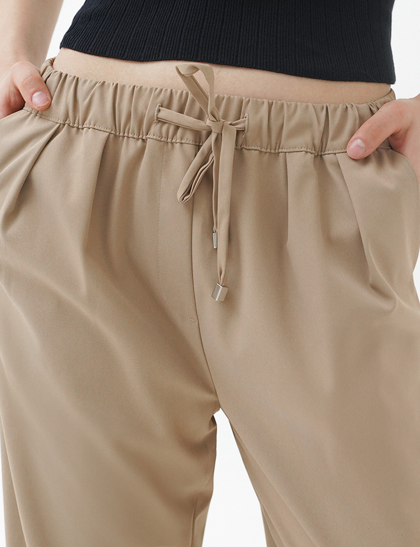 Flowing mid-rise trousers featuring an elasticated waistband with adjustable drawstrings, front darts and a straight-leg design high-waisted a-line flowy midi skirt with button and american zip fastening.