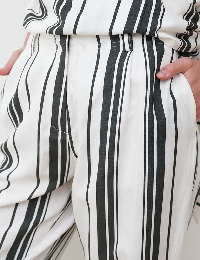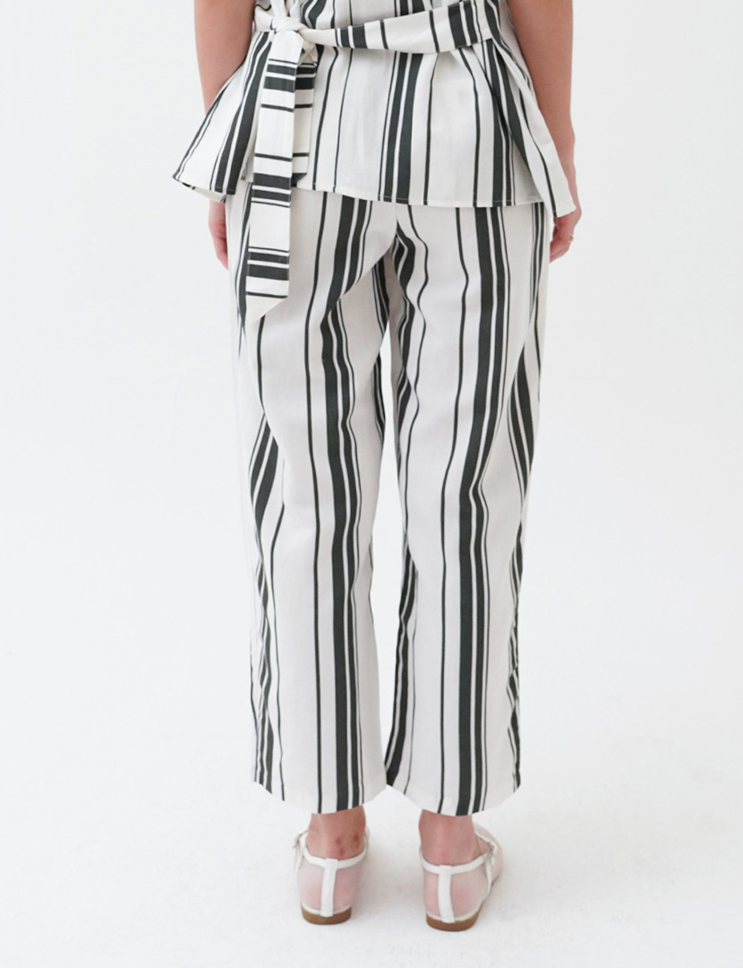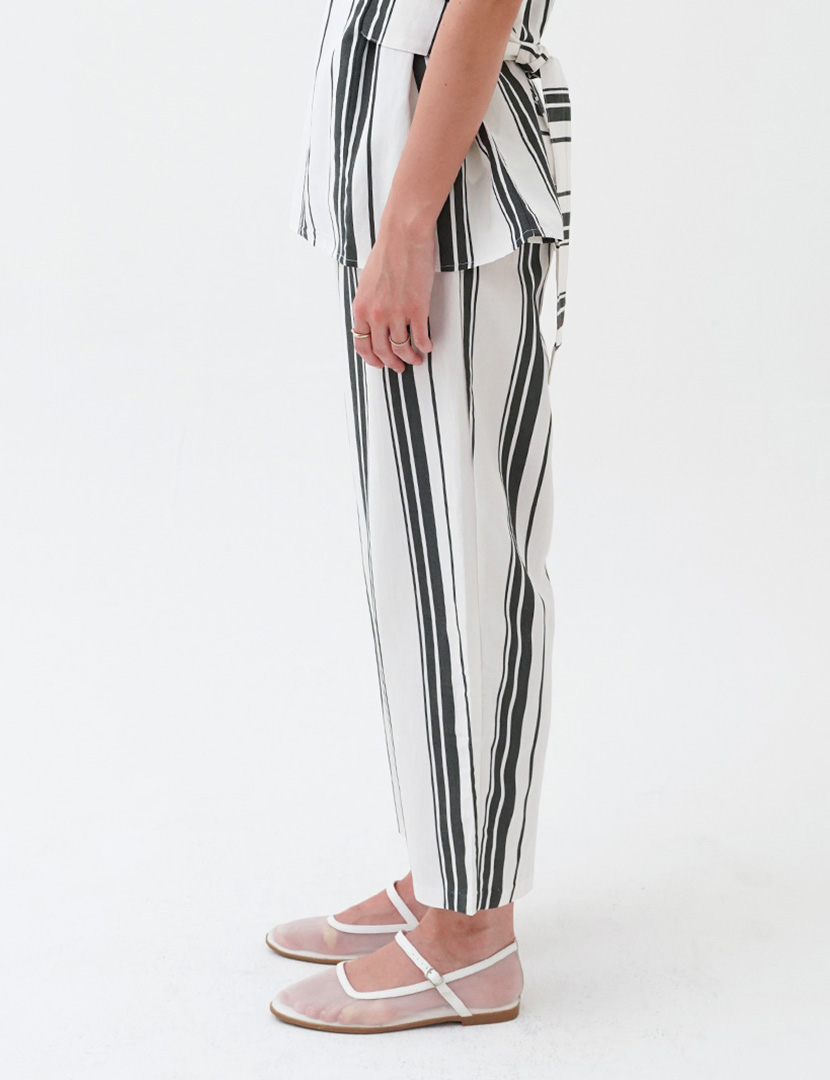 Striped linen pants with high waist, cropped barrel leg, hook and bar closure, and slant pockets.
