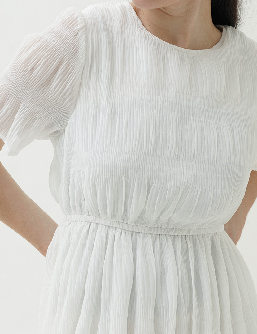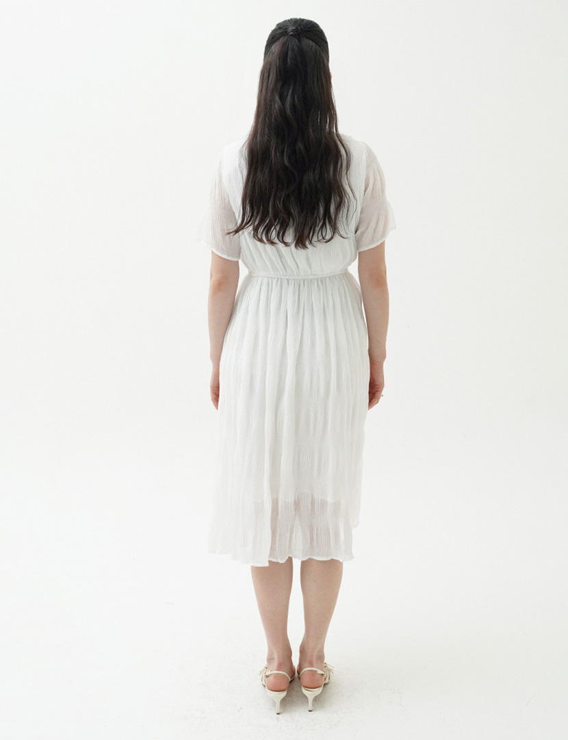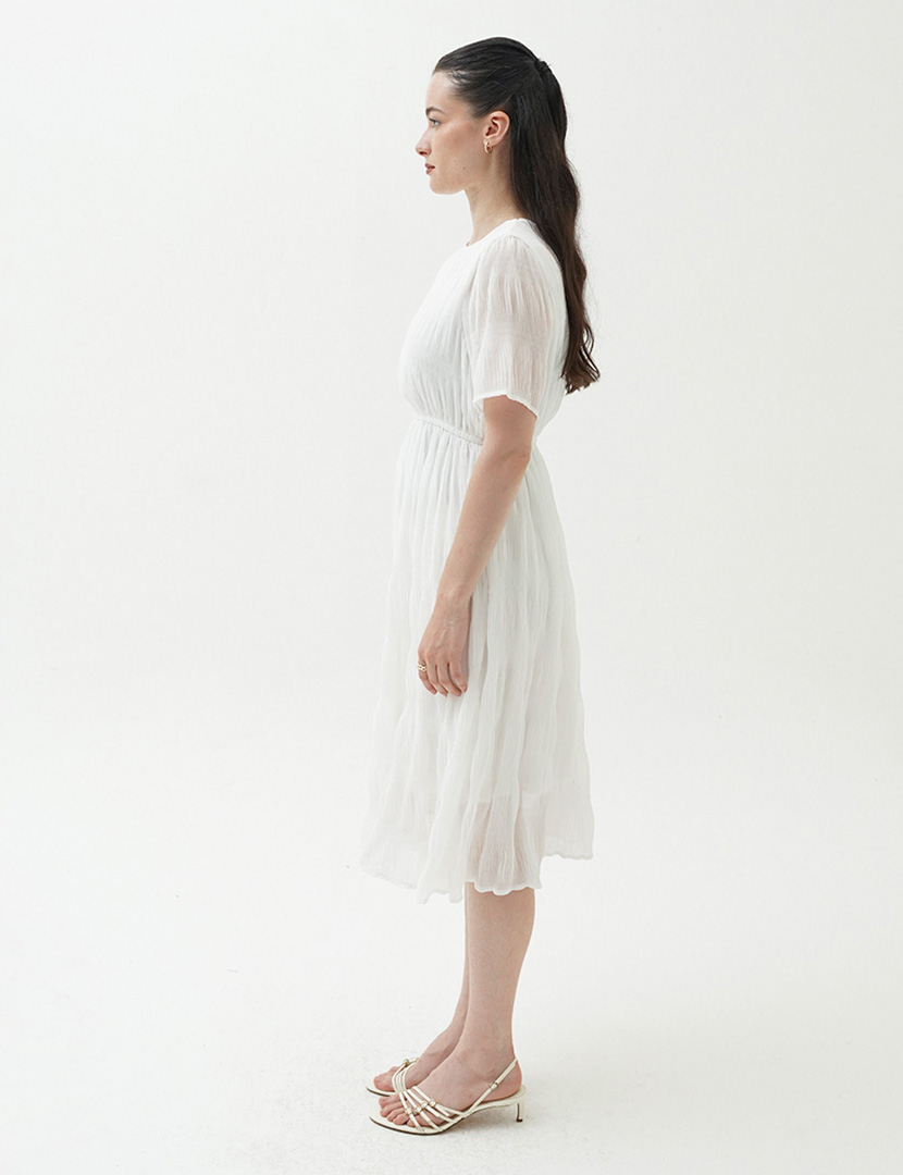 Midi dress featuring a crew collar and short sleeves with elasticated waist, back button fastening.