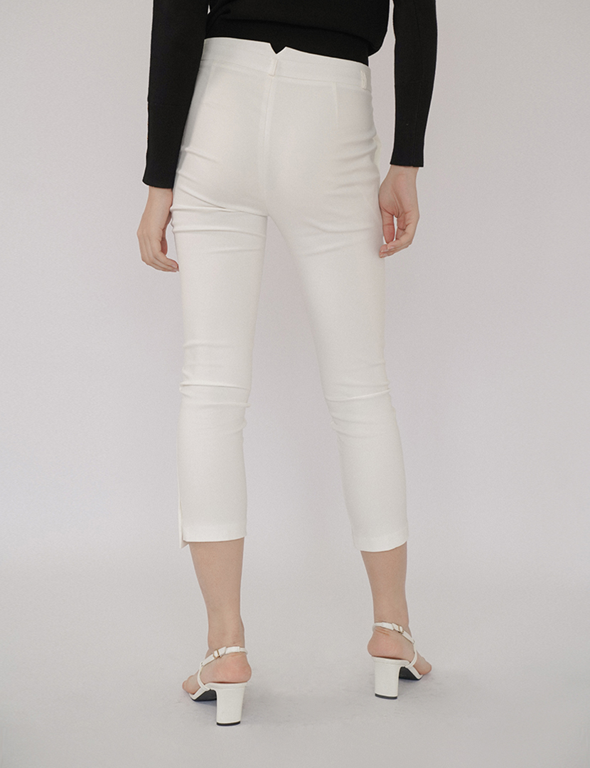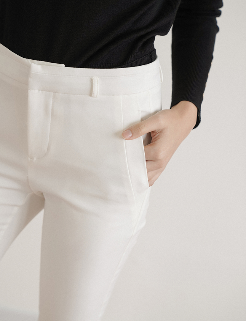 Mid-waist skinny trousers with an elastic waistband at the back. Featuring front pockets & pleats, zip and button fastening at the front.