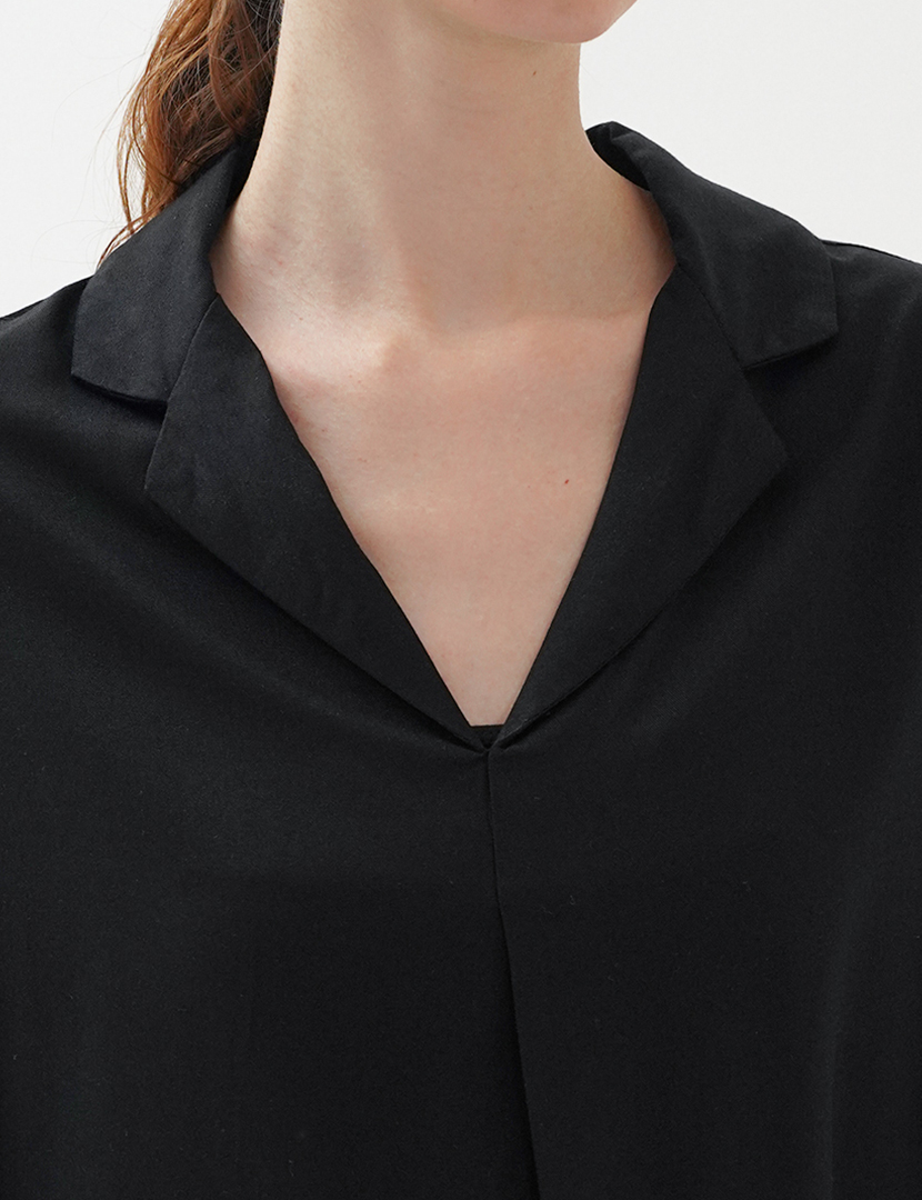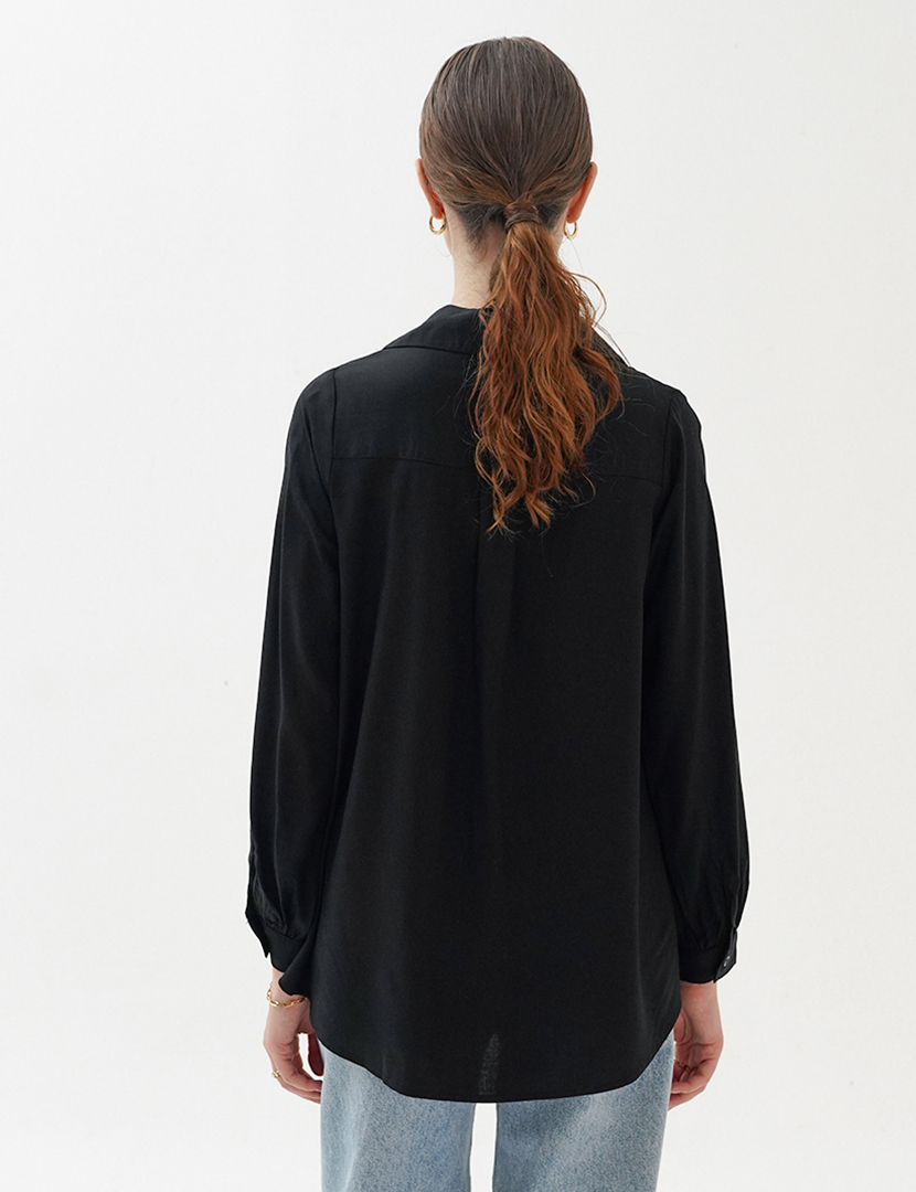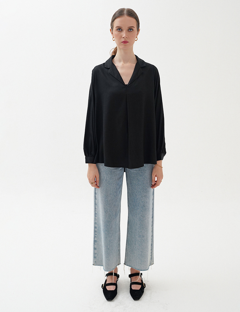 V-neck blouse with long sleeves detail featuring comfortable fabric and loose silhouette.