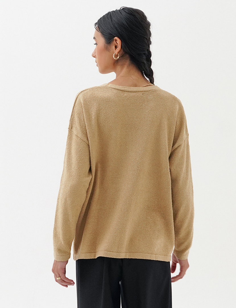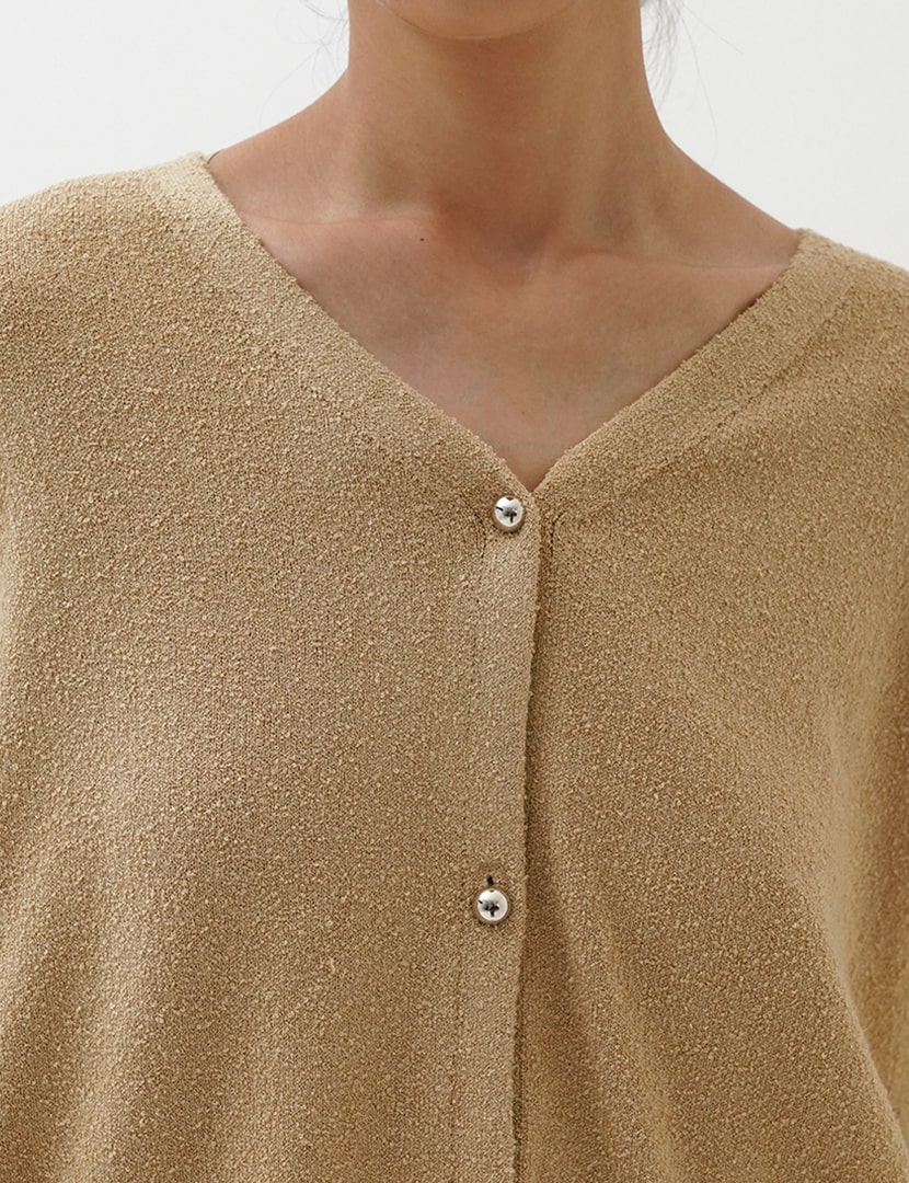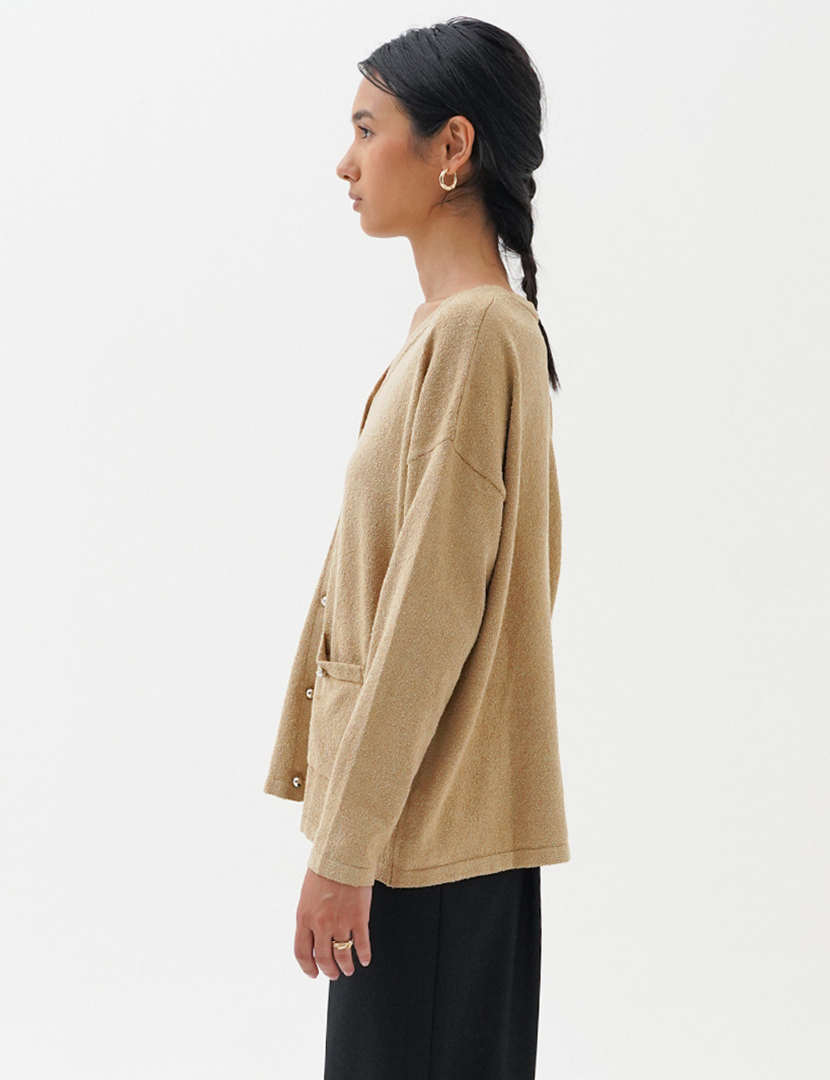 V-neck coatigan with long sleeves. Featuring front patch pockets and a button-up front.