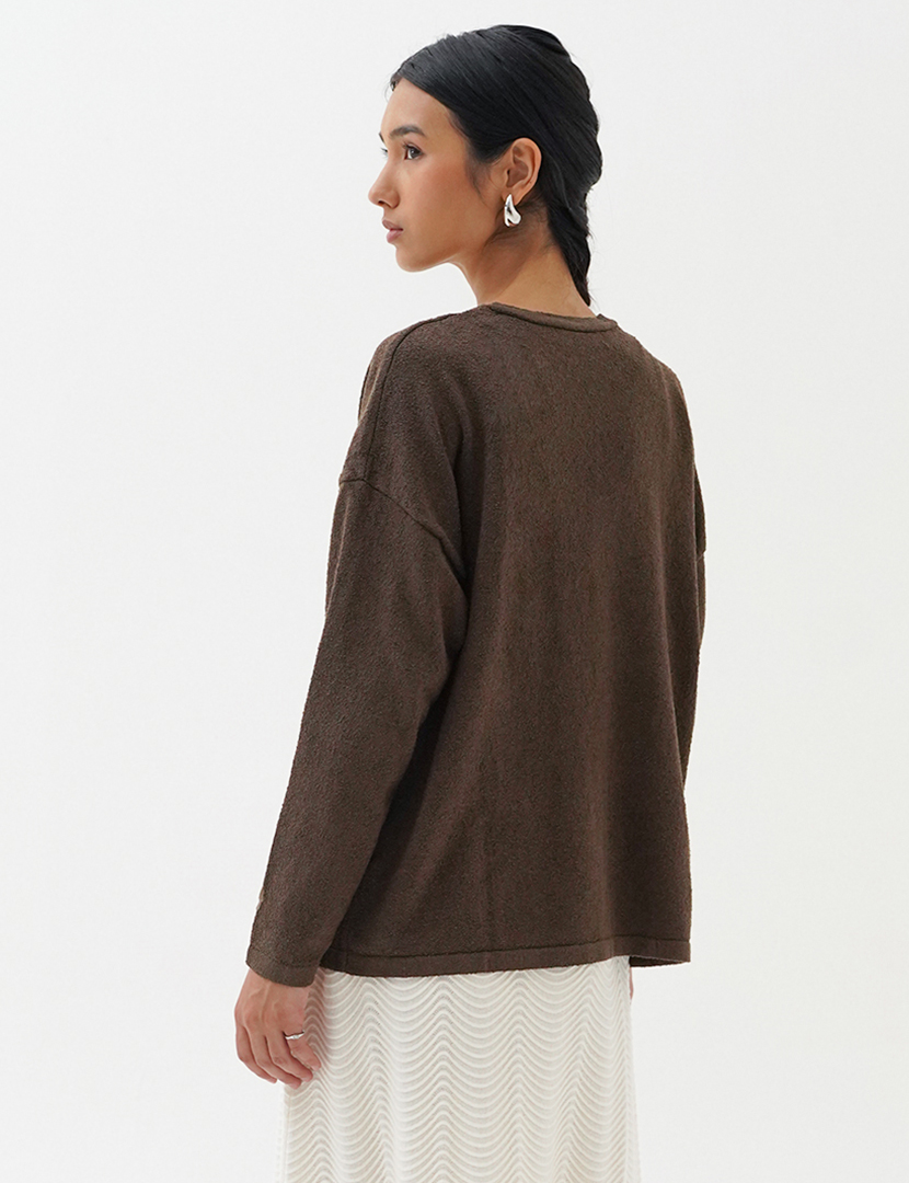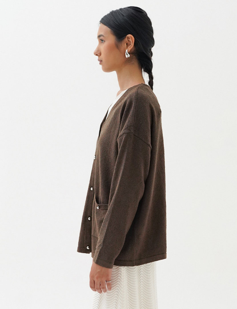 V-neck coatigan with long sleeves. Featuring front patch pockets and a button-up front.