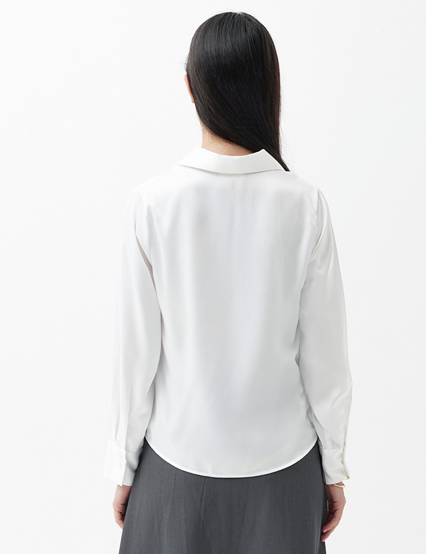 Shirt-style collar with v-neck. Long sleeve and front button closure with office looks.
