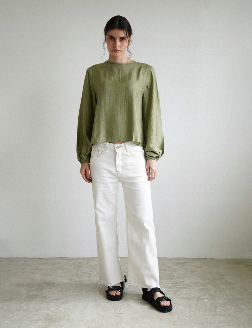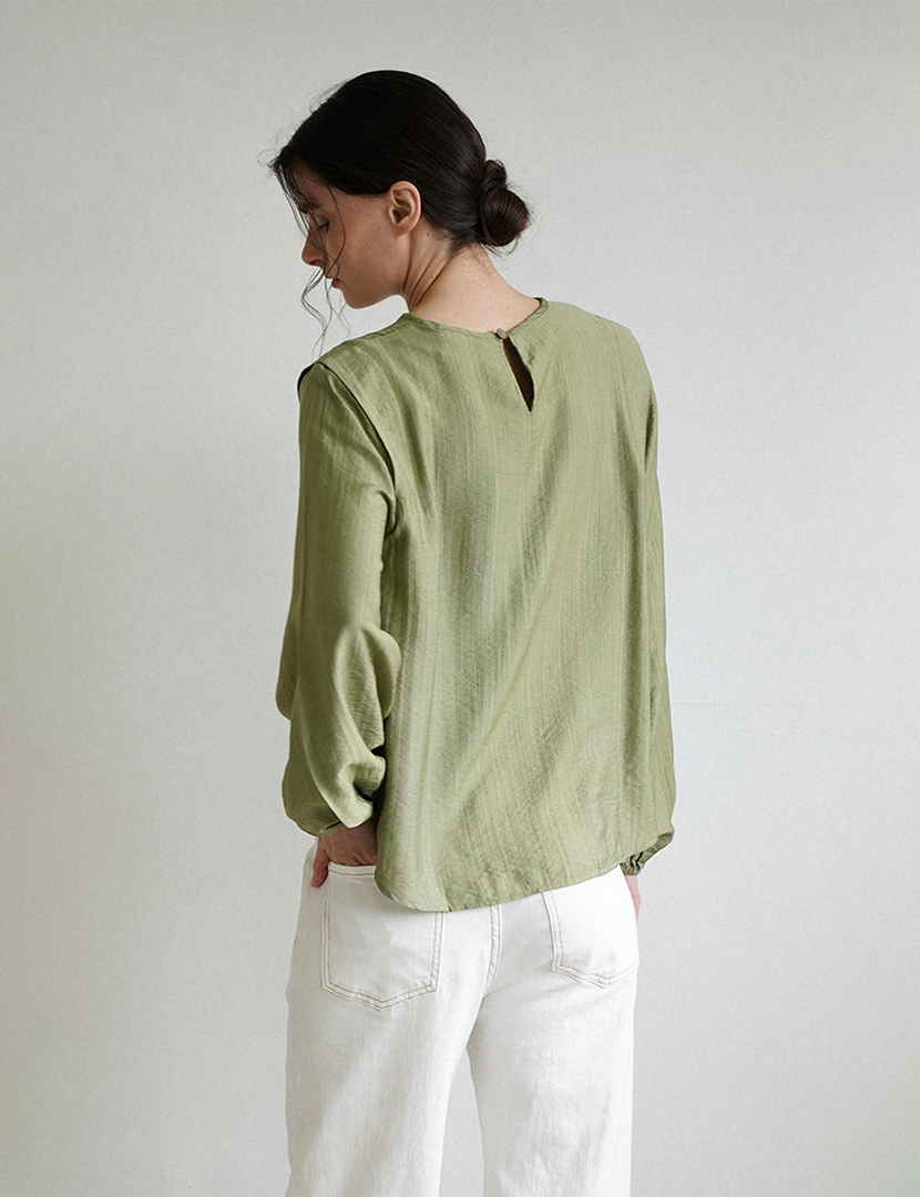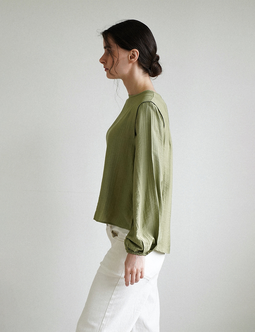 Blouse featuring a crew collar with back button fastening, long puff sleeves with elastic cuffs, sequin appliqués and contrast beads.