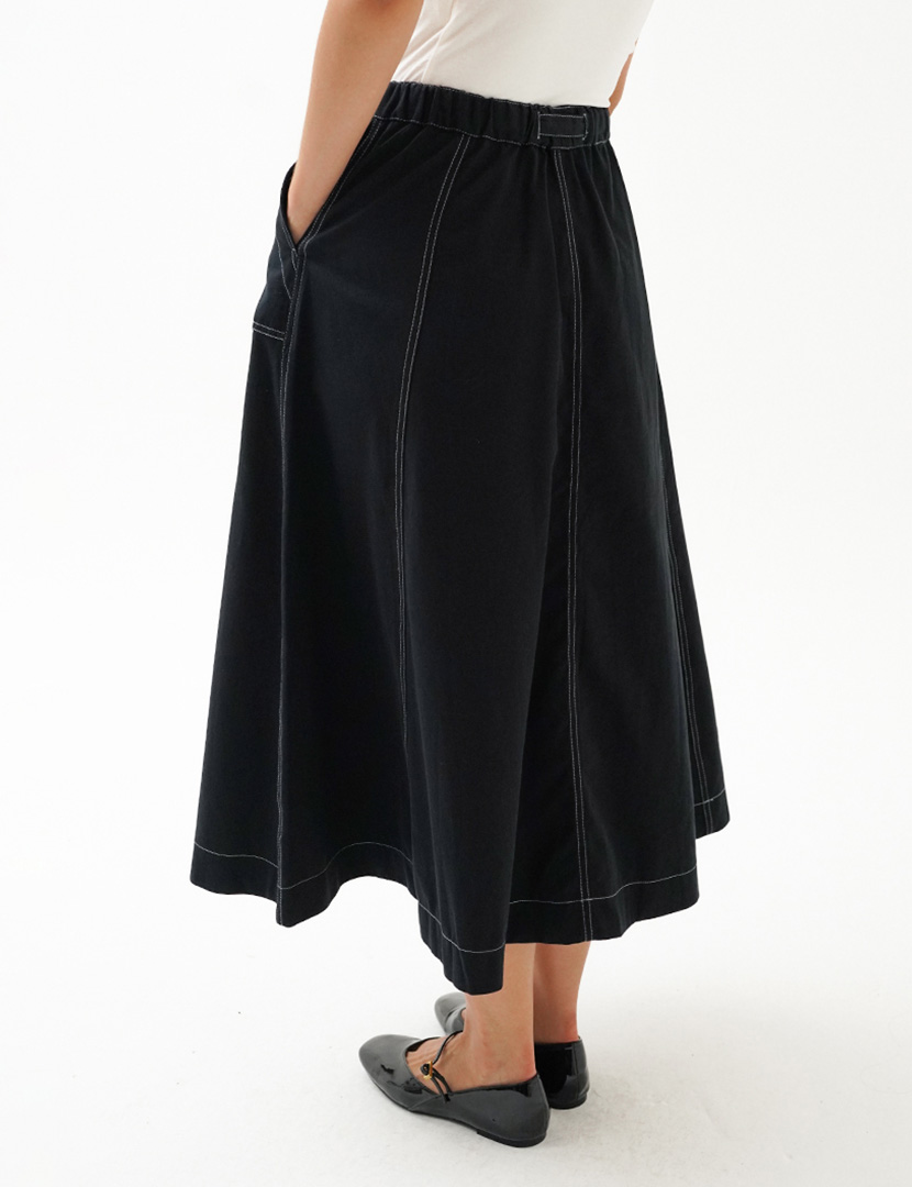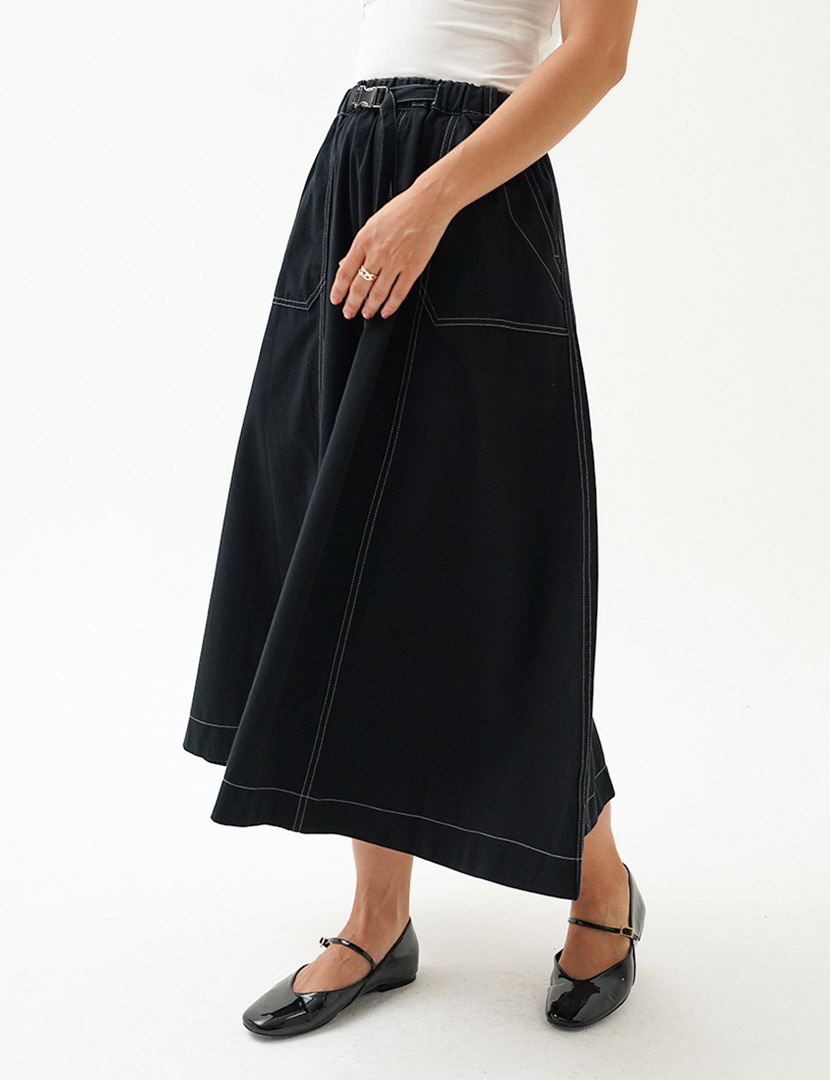 High-waist midi skirt with an elasticated waistband, flared hem with contrast thread details, buckle at the front.