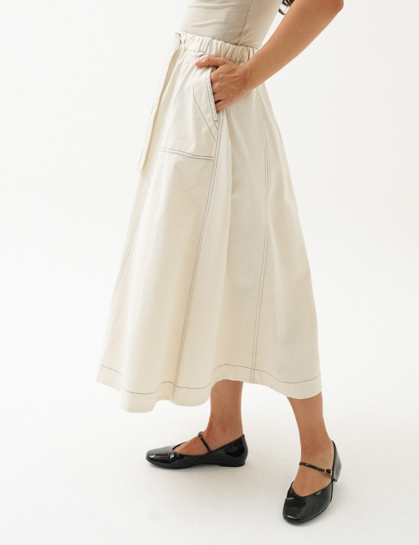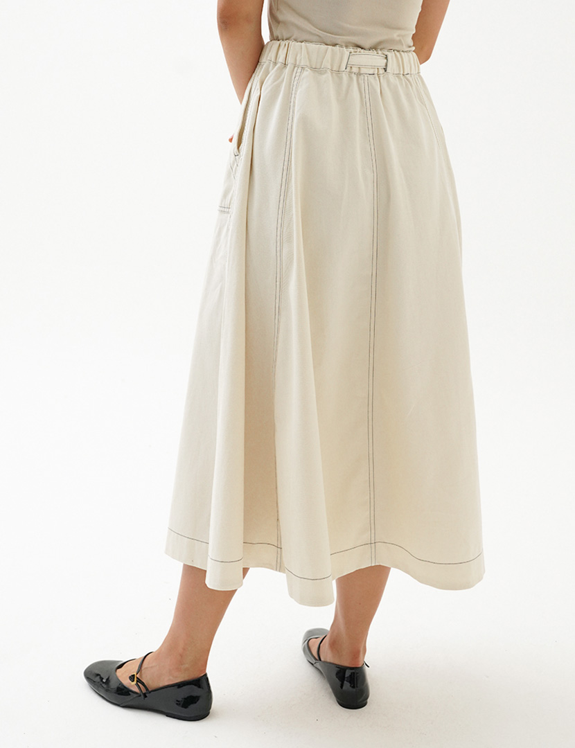 High-waist midi skirt with an elasticated waistband, flared hem with contrast thread details, buckle at the front.