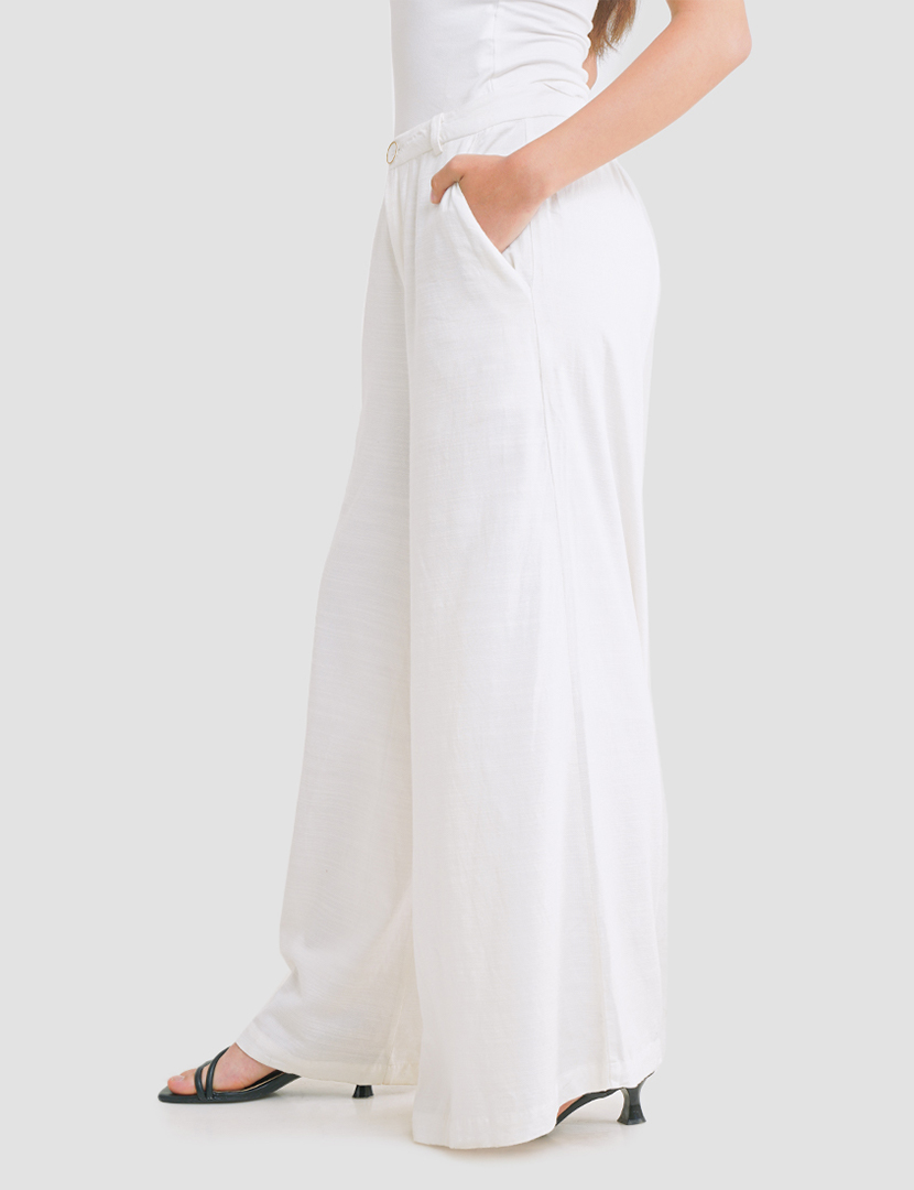 Wide leg trousers featuring an elastic waistband with sided button with front zipper opening.