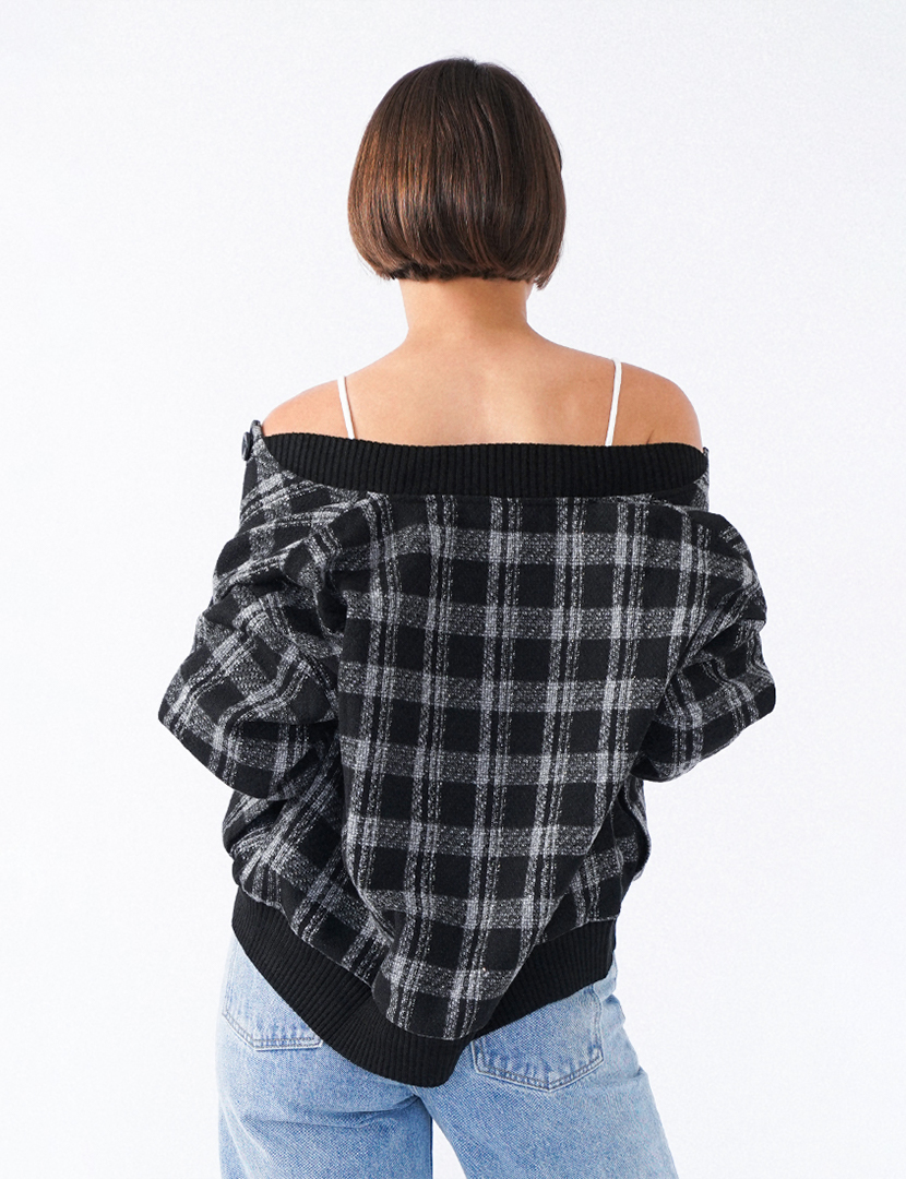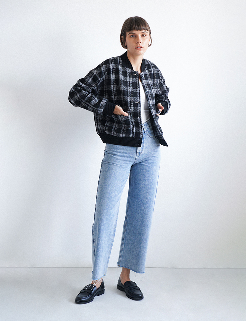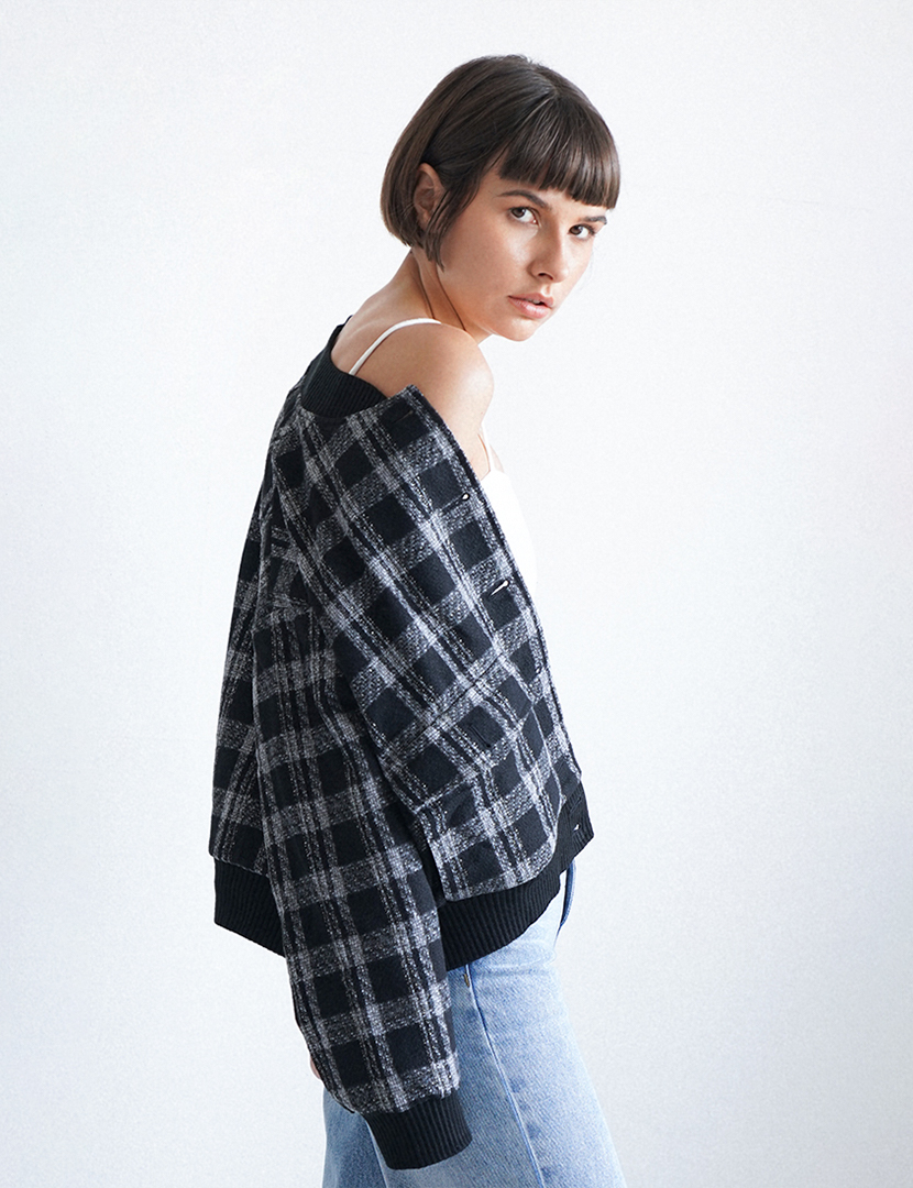 Bomber jacket made of a wool blend. Featuring a high neck, long sleeves with cuffs, plaid pattern, front welt pockets and button fastening at the front.