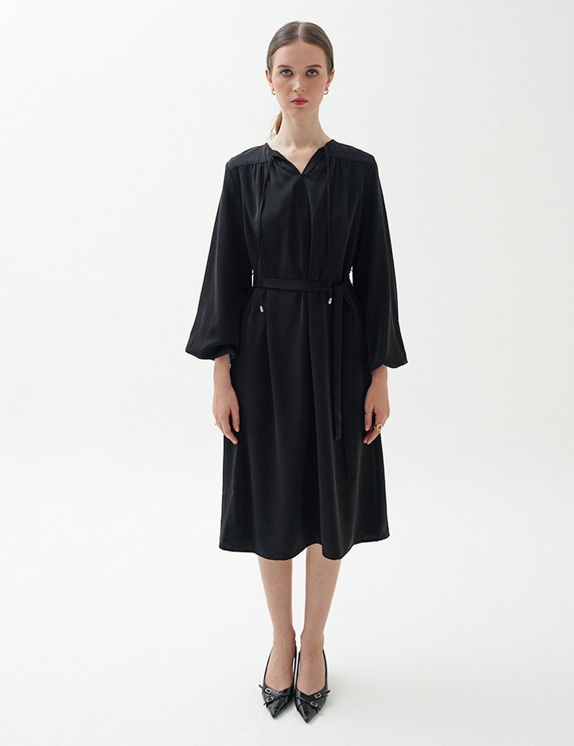 Belted Sateen Midi Dress Black