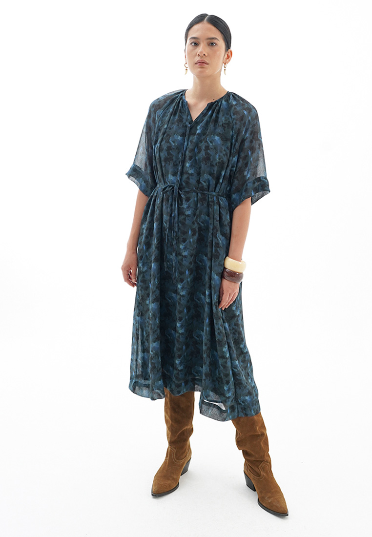 La Nature Cree Midi Dress Belted Waist Black