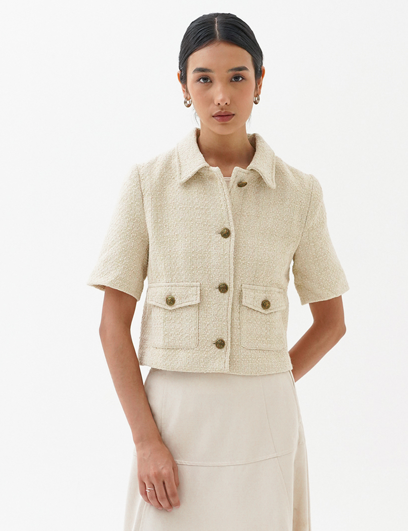 La Naturecree Cropped Cotton Blend Tweed Jacket Beige