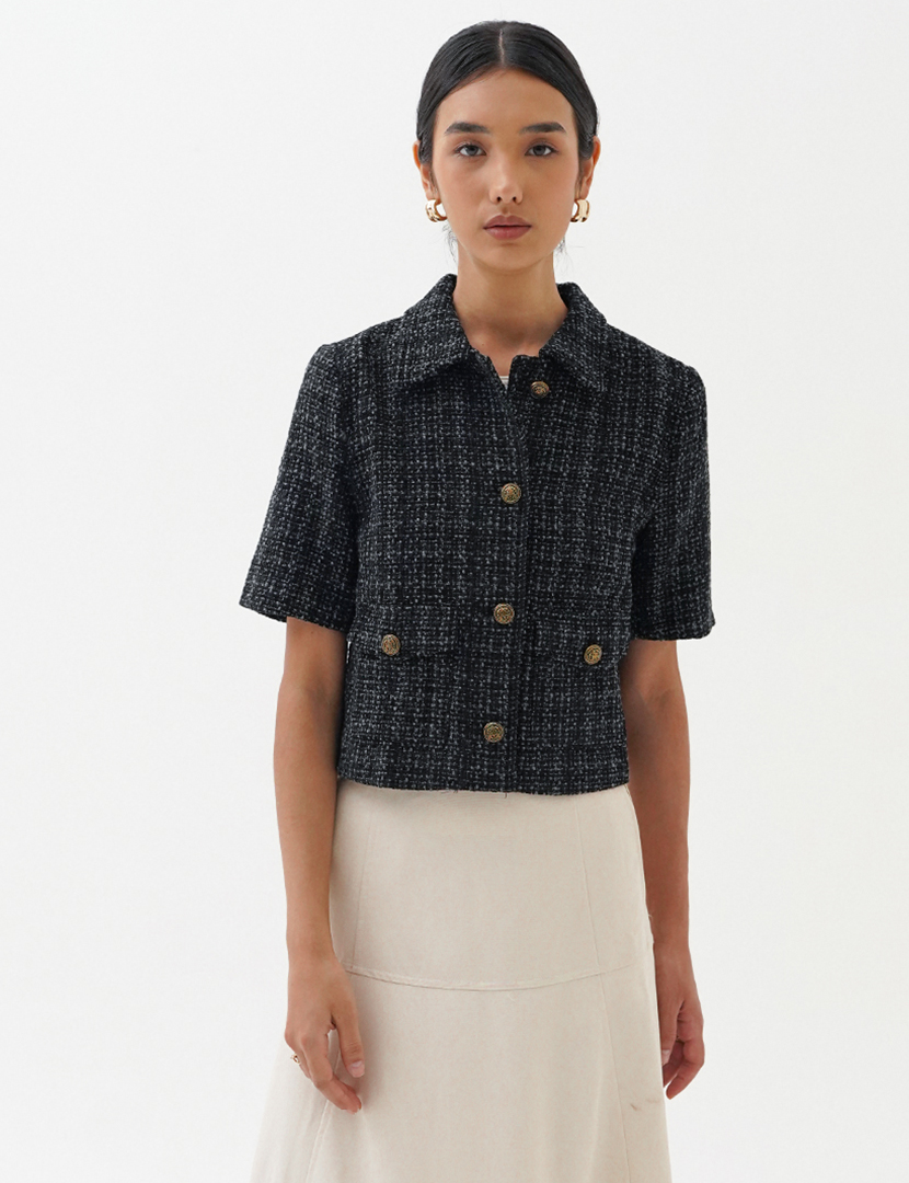 La Naturecree Cropped Cotton Blend Tweed Jacket Black